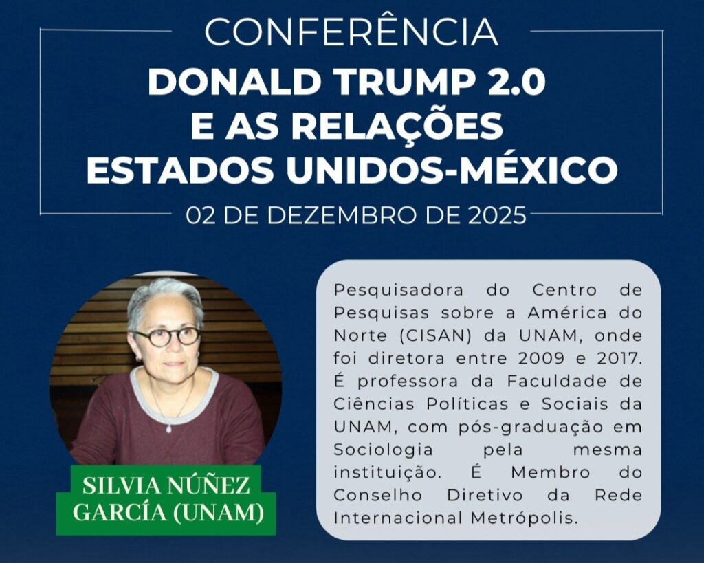 No próximo dia 2 de dezembro, a Universidade de Brasília (UnB) sediará a conferência internacional “Donald Trump 2.0 e as Relações Estados Unidos-México”, com a presença da renomada pesquisadora Silvia Núñez García.