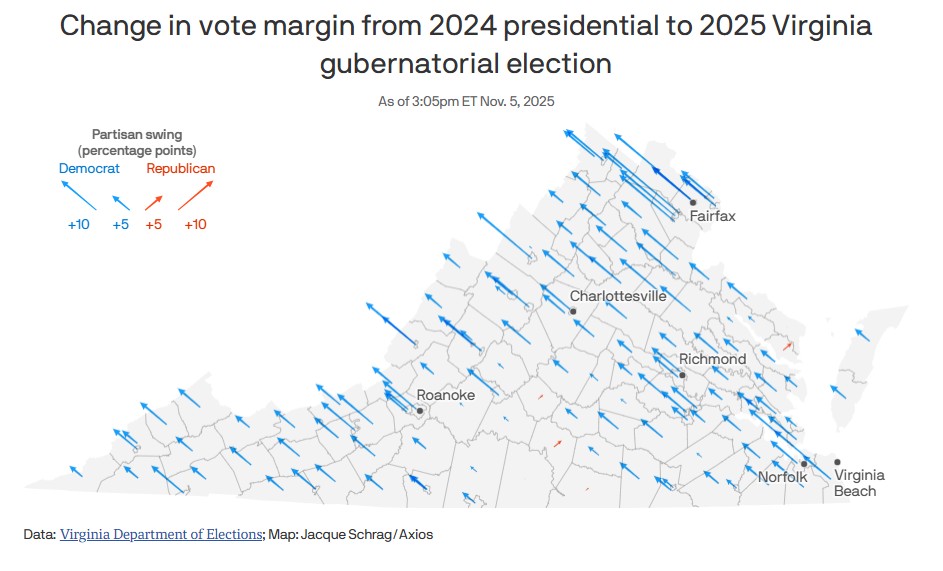 Mapa detalha movimento significativo a favor dos democratas na esmagadora maioria dos condados da Virgínia (Créditos: Jacque Schrag/Axios, com dados do Departamento de Eleições da Virgínia)